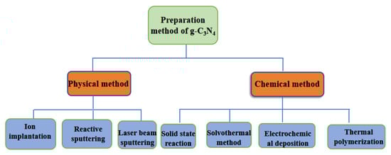 g-C3N4 nanomaterials are usually prepared by selecting appropriate carbon and nitrogen sources (i.e., melamine, cyanuric chloride, dicyandiamide, urea and thiourea) as reactants under certain reaction conditions [51,52,53,54,55]. Figure 3 is a diagram of the methods currently used to prepare g-C3N4. The most commonly used methods are thermal polymerization, vapor deposition, high temperature, and high-pressure synthesis and solvothermal synthesis [56,57,58].