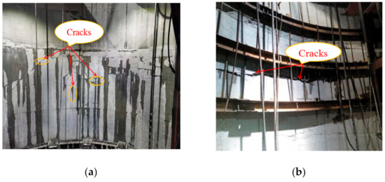 In coal mining, the vertical shaft is an important channel for moving personnel up and down, ventilation, drainage, and coal lifting [1,2,3], and its supporting structure is called the shaft lining structure [4,5]. When a newly established shaft passes through deep alluvium, it needs to be constructed by a special drilling method. Freezing shaft sinking has the advantages of strong construction adaptability, flexible supporting structure, and fast completion speed; therefore, it has become the main method of construction in China [6,7,8]. In order to resist strong external loads, high-strength concrete is usually selected as the building material for walls in the structural design of frozen shaft lining in deep alluvium, and the outer shaft wall is required to have the characteristics of early strength [9,10]. With the increase in the depth of the well construction, the thickness of the inner and outer sidewalls of the deep alluvium shaft is greatly increased, the hydration heat generated during the pouring of the shaft is high, and the environmental temperature varies greatly during construction, so the high-strength concrete of the shaft lining easily produces temperature cracks [11]. Especially in the method of shaft sinking by freezing in deep alluvium, the freezing pressure on the outer wall of the shaft is obviously unevenly distributed, due to the uneven distribution of the saline flow at the freezing hole deviation, which is extremely adverse to the force on the shaft lining and can easily cause the tensile failure of the high-strength concrete [12,13]. Figure 1 shows the cracks of high-strength concrete in shaft lining.
