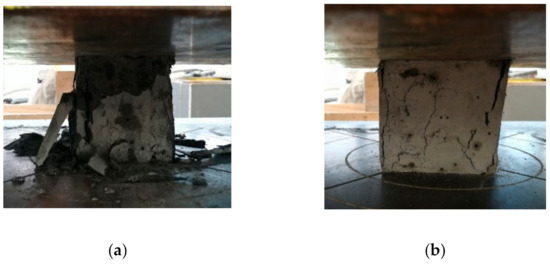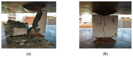 Comparison of compression failure modes of specimens: (a) Reference group; (b) hybrid fiber group.