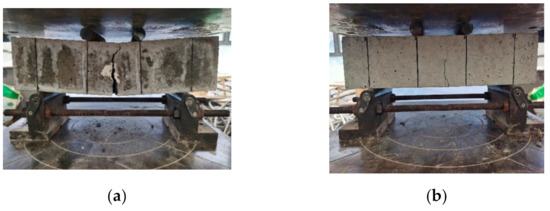 Comparison of flexural failure modes of specimens: (a) Reference group; (b) hybrid fiber group.