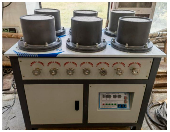 The ability of concrete to resist seepage under the action of water pressure is called impermeability, which is an important index that reflects the durability of concrete. Based on the GBJ82-2009 [31] specification, a water penetration test was carried out using the penetration height method. A digital display automatic adjusting concrete impervious meter was selected as the measuring device. Additionally, Φ 175 × 185 × 150 cylindrical specimens were selected, with six pieces in each group. The test was carried out after 28 days of standard maintenance of the specimens, and the loading device is shown in Figure 6.