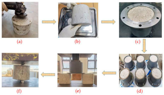 - After the test was completed, the sleeve mold was removed, and a press was used to demold and split the specimen to observe the section. Ten measuring points were taken from each specimen, and the water seepage height at each point was measured. A flow chart of the operation steps is shown in Figure 7.