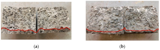 Table 8 shows the average height of water seepage and the calculated relative permeability coefficient of the two groups of specimens after 24 h of pressure stabilization at 3.6 MPa water pressure. It can be seen from Table 8 and Figure 8 that the water seepage height of the two groups of specimens was not large, which indicates that impermeability of both specimen groups is good and meets the impermeability requirements of high-performance concrete. This is mainly because the water–binder ratio is relatively low; at the same time, in the admixture, the slag and silicon powder generated hydration products to improve the compactness of concrete and reduce the number of pores. In addition, the average water permeability height and relative permeability coefficient of the concrete in the hybrid fiber group were significantly lower than those in the reference group, and the average water permeability height was 31.7% lower than that in the reference group. Compared with the reference group, the relative permeability coefficient decreased by 53.3%. This shows that the incorporation of hybrid fiber can further improve the impermeability of concrete.