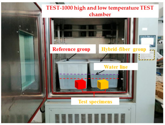 Freezing resistance capacity is another important indicator reflecting the durability of concrete. Considering the particularity of the environment in which the structure of a frozen shaft is located, the concrete of the shaft lining should meet certain requirements of freezing resistance [32,33]. The TEST-1000 high and low temperature TEST chamber was selected, and the temperature control range can reach −60 °C~+150 °C. As shown in Figure 9, small cube specimens with a side length of 100 mm were selected for the test. The slow freezing method was adopted to first maintain the specimens in the curing box and then in the water tank. At this time, the water surface temperature no lower than that of the surface of the specimens, and then, they were placed in the test box for freeze–thaw cycle testing. The specimens were frozen at −15 °C for 4 h and then melted in a 20 °C water tank for 6 h. After freezing and thawing, it was regarded as a freeze–thaw cycle.