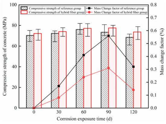 As shown in Table 11, when the corrosion exposure time were 30d, 60d, 90d, and 120d, the strong growth rates of the specimens in the reference group and the hybrid fiber group were 2.8%, 8.3%, 4.4%, and –2.6%, and 2.6%, 6.9%, 7.5%, and 2.1%, respectively. After 120d of corrosion, the strength of the reference group specimens decreased by 2.6%, while the strength of the hybrid fiber group specimens was still in the growth stage, and the strength was 1.076 times that of the reference group, which indicated that the hybrid fiber could effectively slow down the strength loss of concrete after sulfate corrosion. In order to analyze the relationship between the change factors of the compressive strength and mass of concrete specimens and the change in corrosion exposure time more intuitively, the results in Table 10 and Table 11 were drawn into a double-Y-axis, columnar-broken line diagram, as shown in Figure 12.
