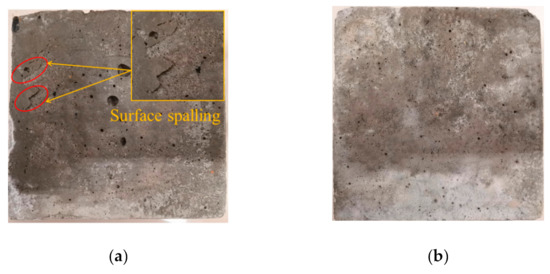 Overall, after 120 days of sulfate corrosion, there was no obvious mass loss in the reference group and hybrid fiber group, and the compressive strength of the hybrid fiber-reinforced concrete did not decrease but rather even slightly improved. Additionally, the apparent integrity of specimen morphology was relatively high, while the concrete of reference group has obvious surface spalling, as shown in Figure 13. Therefore, the hybrid fiber concrete has good corrosion resistance.