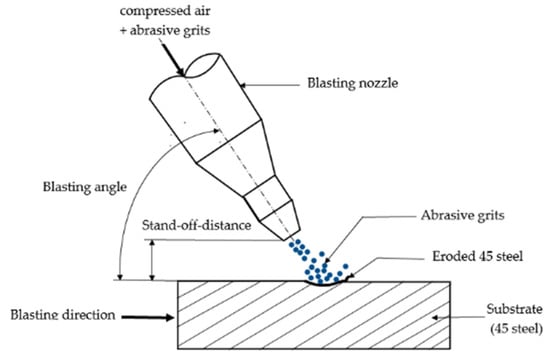 Ni-W/SiC nanocomposite coatings were deposited on 45 steel samples measuring 30 mm × 8 mm × 7 mm using the conventional electrodeposition technique. For the first phase, steel samples were pretreated using the grit blasting technique and then rinsed thoroughly in an electrostatic agitator using double-distilled water to remove any loose metal pieces. The grit-blasted samples (Figure 1a) were subjected to a triple-immersion pretreatment process for electric cleaning. They were then immersed into the electrolyte for the deposition process. Grit blasting was performed using an abrasive grit blasting machine having a nozzle diameter of 8 mm, 1 mm steel grit particles, stand-off-distance of 100 mm and a blasting angle of 45° at a pressure of 0.6 MPa. The schematic diagram of the grit blasting nozzle and substrate is shown in Figure 2.