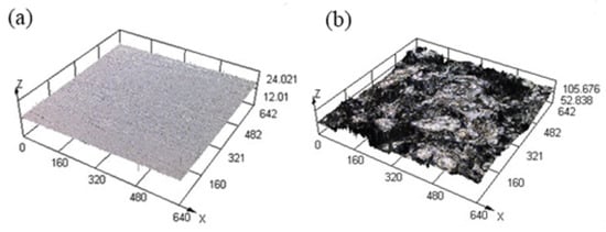 Figure 3 shows the 3D surface morphology of the samples exposed to the polishing pretreatment and grit-blasting pretreatment. Observing Figure 3a, it can be seen that the surface of the 45 steel subjected to a polishing pre-treatment was smooth without undulations while the grit-blasted surface showed large undulations with an obvious mountain peak and ravine morphology (Figure 3b). The results show that the grit-blasting pretreatment could impart a rough appearance on the 45 steel surface. The surfaces roughness of the polished and grit-blasted substrates was evaluated. Table 4 contains the different roughness values (square root roughness (Sa) and mean square root roughness (Sq)) according to the different pretreatments. It can be seen that the values of the square root roughness of the 45 steel having undergone the polishing and grit-blasting pretreatment were 0.0047 ± 0.0007 µm and 1.0243 ± 0.3 µm, respectively. While the mean square root roughness values were 0.0057 ± 0.0007 µm, and 1.4237 ± 0.410 µm, respectively, suggesting the enhanced effect of the grit blasting treatment on the surface roughness. Considering these different results, it appears that the surface roughness could be significantly increased by the use of a grit-blasting pretreatment. This was found to be in agreement with the results reported in a previous study by the authors [23,25,26,27,28].