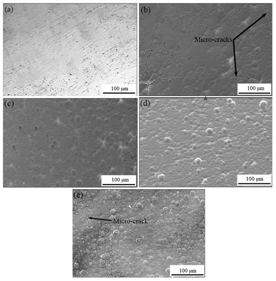 SEM images of the surface morphologies of the grit-blasted, polished specimens and Ni-W and Ni-W/SiC coatings on 45 steel substrates subjected to two different pretreatments, prepared by conventional electrodeposition, are shown in Figure 4 and Figure 5. From Figure 4a and Figure 5a, it can be seen that a large number of random deformations in the form of bulges and pits were observed on the surface of the grit-blasted specimen, while the polished surface was flat and smooth with no scratches. Similar results were reported in previous studies [29,30].