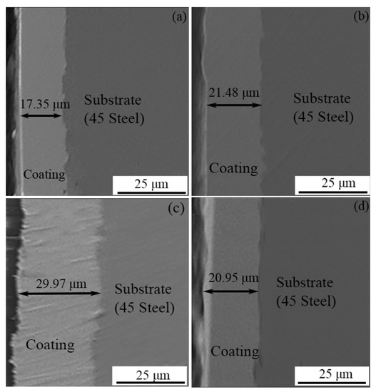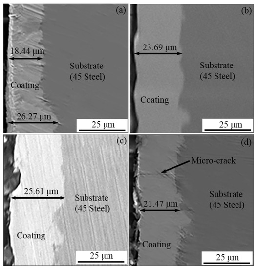 SEM micrographs, illustrating the coating cross section of the Ni-W/SiC nanocomposite coatings obtained at different SiC concentrations—(a) 0 g L−1, (b) 3 g L−1, (c) 6 g L−1 and (d) 12 g L−1—on polished 45 steel substrate surfaces.