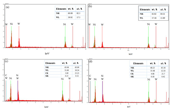 EDS spectra of (a) Ni-W(P), (b) Ni-W(GB), (c) Ni-W/SiC(P) and (d) Ni-W/SiC(GB).