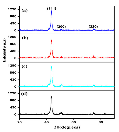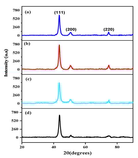 For both the grit blasting and polishing processes. The XRD results presented in Figure 10 and Figure 11 show that the peaks corresponding to the SiC nanoparticles were not detected on the XRD pattern of the nanocomposite coatings but was confirmed by the EDS analysis. This was due to the low reinforcement content of the SiC nanoparticle in the deposited composite [40]. The crystallite size of the Ni-W alloy coating and of the Ni-W/SiC composite coatings was calculated using Scherer’s equation and the grain values for the various electrodeposits are shown in Figure 12. The crystallite grain size of the Ni-W/SiC nanocomposite was observed to decrease as compared to the Ni-W coating for all the pretreatment processes.