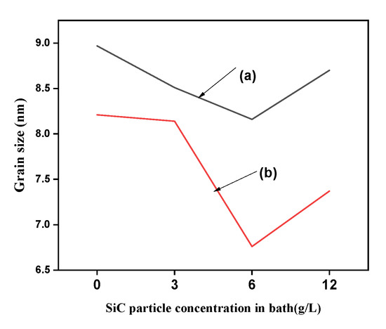 As shown in Figure 12a, the grain size of the Ni-W/SiC coatings obtained in the case of the polishing pretreatment process Figure 12a from the plating bath with different SiC nanoparticle concentration decreased with the increase in SiC concentration from 8.97 nm at 0 g L−1 to 8.16 nm at 6 g L−1 beyond which it increased to 8.7 nm at 12 g L−1. Concerning the grit-blasting pretreatment (Figure 12b), the grain size of the Ni-W/SiC coatings obtained from the plating bath with the different SiC nanoparticle concentration decreased with the increase in SiC concentration from 8.21 nm at 0 g L−1 to 6.76 nm at 6 g L−1 beyond which it increased to 7.37 nm at 12 g L−1. A similar trend was confirmed in previous publications [41,42,43]. From the result, the smallest grain size for both pretreatment processes was obtained at 6 g L−1.