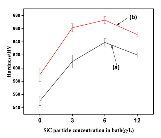 For objects subjected to a wear environment, two important properties of wear resistance and hardness are essential. Figure 13 presents the microhardness of the Ni-W/SiC nanocomposite coatings on the (a) polished and (b) grit-blasted 45 steel as a function of SiC concentration. It was noted that for the grit-blasting or polishing pretreatment processes, the microhardness increased with the increase in the concentration of SiC, such that the microhardness of all the Ni-W/SiC nanocomposite coatings were higher than that of the Ni-W coating alloy. Without SiC, the deposited Ni-W exhibited the hardness for polishing and grit blasting of 550.25 ± 7.04 Hv and 589.89 ± 10 Hv, respectively. The presence of SiC in the Ni-W coatings considerably increased the microhardness for all pretreatment processes. It is clear that an increase in the amount of SiC particle codeposition led to an increase in the hardness of the coatings. With an increase in the SiC concentration from 3 to 6 g L−1, the microhardness increased for the polishing and grit-blasting processes to 639.12 ± 5.76 Hv and 673 ± 5.47 Hv, respectively, before decreasing when the concentration of SiC was increased from 6 to 12 g L−1. This effect of the nanoparticle on the coatings alloys has been described in previous research [15,44,45,46]. One possible reason for this result is that the SiC nanoparticles in the Ni-W/SiC coating blocked the dislocation movement and sliding at the grain boundary of the matrix, thereby increasing the micro-hardness of the Ni-W/SiC. The alloy matrix strengthening mechanism is mainly due to grain refinement, particle strengthening and dispersion hardening effects [42]. The higest hardness was obtained with the nanocomposite with the lowest grain size of 6.76 nm.