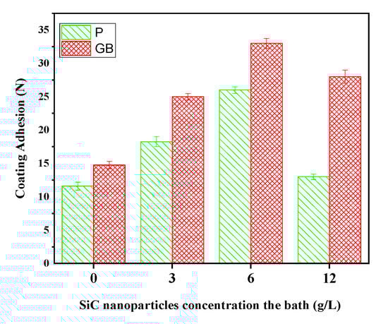 Figure 14 shows the adhesion of the coatings prepared on 45 steel substrates by electrodeposition with different pretreatment processes and by varying the SiC concentration. One of the important factors that degrades the protective performance and corrosion process of coatings is adhesion. Therefore, poor adhesion can cause performance failure of the Ni-W/SiC coatings. It was found that the adhesion of Ni-W alloys was not deteriorated by nanoparticles in any case whether the substrate was pretreated by polishing or by grit blasting. The addition of SiC inhibited the growth of the Ni-W grain, and the grain size of the coating was refined. The effective contact area between the coating and the substrate increased and based on the mechanism of the dispersal reinforcement of the nanoparticles, the adhesion of the coatings improved [47]. The adhesion of the Ni-W alloy coating on the polished and grit-blasted substrates was 11.25 N and 14.25 N, respectively. The Ni-W coating adhesion of the polished substrate was lower than that of the grit-blasted substrate. This remark is due to the rough surface obtained after blasting, which leads to the extrusion of the protrusions in the scratches. Fu et al. [27] studied the influence of the region of penetration elements on the adhesion and corrosion performance of the Ni-based coatings and indicated pre-processing by sanding increased the effective contact surface between the substrate and the coating and participated in the widening of the area of penetration of the element, which led to improved adhesion of the coating. Moreover, the grit-blasted surface has a larger contact area and better conditions for mechanical anchoring of the coating. Cheng et al. [24] found that the high surface roughness of the surfaces provided the higher adhesion force. Whether in the polishing or grit-blasting pretreatment, with the addition of the nano-SiC particles from 3–6 g L−1, the adhesion of the composite coatings gradually increased before decreasing when the nano-SiC concentration was from 6 to 12 g L−1. After the polishing pretreatment, the adhesion of the Ni-W/SiC coating increased to 26 ± 0.5 N (SiC of 6 g L−1) before decreasing to 13 N (12 g L−1 of SiC). This effect of the SiC nano-particles was confirmed by the previous studies [37,45]. Adhesion obtained after the grit-blasting pretreatment increased to 33 ± 0.75 N (6 g L−1 of SiC) before decreasing to 28 ± 1 N (12 g L−1 of SiC). This indicates an improvement in the interface bond strength between the coating and the metal substrate. This may be due to the high hardness of the SiC nanoparticles, which played a major role in the coupling of the matrix [20]. It should be noted that the fact that the size of the Ni-W crystal is much larger than those of the SiC nanoparticles, as the SiC nanoparticles could fill the pores between the grains of the Ni-W deposits, which could participate in the reduction of the porosity and improve the compactness of the coating. The metal matrix with a fine grain had a relatively high yield strength, according to the Hall–Petch equation [48,49]. The finer the size of the grain the larger the grain limit and this hinders the dislocation movement. Thus, the accumulation of dislocation at the boundary of the grain led to an increase in the strength of the coating. This remark is confirmed in Figure 12 and Figure 15. In this study, the coatings with the small grain size had better coating adhesion for both the polishing and grit-blasting pretreatments.