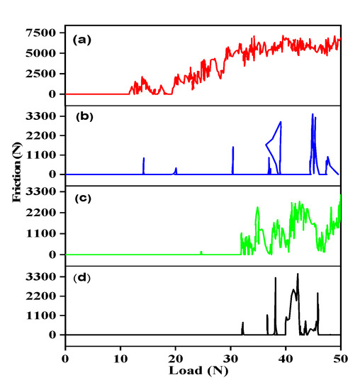 Figure 9 presents the EDS spectrum of the Ni-W coatings pretreated by polishing: Ni-W(P); pretreated by grit blasting: Ni-W(GB) and Ni-W/SiC nanocomposite coatings; pretreated by polishing: Ni-W/SiC(P); and grit-blasting pretreated: Ni-W/SiC(GB). As can be seen in Figure 9a,b, the EDS spectra of the Ni-W coatings prepared under the different processes present the peaks of Ni and W, where the Si and C content were not found. As can be seen in Figure 9c,d, besides the Ni peaks, peaks corresponding to W and Si are also seen, and C is also visible in the all cases; that is, the SiC particles were successfully co-deposited in the Ni-W coatings. With polishing or grit-blasting pretreatments, the incorporation of SiC into Ni-W reduced the amount of Ni and W. According to Gyawali et al. [40], the decrease in Ni and W in the coating during the codeposition of SiC nanoparticles can be explained in terms of Faraday’s efficiency. According to Figure 9c,d, the Ni-W/SiC(P) (6 g L−1 of SiC) coating has a lesser content of W (31.6 wt. %) as compared to Ni-W/SiC(GB) (6 g L−1 of SiC), (35.48 wt. %). Moreover, the SiC content in all cases was low.