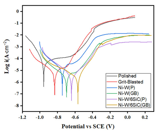 Figure 16 shows the polarization curves of coatings fabricated on 45 steel substrates subjected to the different pretreatment processes. The extrapolation method was to determine the corrosion potential (Ecorr), corrosion current density (icorr), the polarization resistance (Rp) and corrosion rate (rcorr), as shown in Table 5. The results show that, compared to polished samples, the corrosion potential of the grit-blasted substrate increased from −957 to −830 mV, and the polarization resistance increased from −957 to −830 mV, implying pre-treatment by grit blasting improved significantly the substrate’s surface corrosion resistance. This is because after pre-processing by grit blasting, a rough structure was generated and after the infiltration of the corrosion products they could not be easily diffused. Similar results were found by Fu et al. and Zhang et al. [27,30]. Compared with the base substrate, it was found that the corrosion potential of the Ni-W coating was significantly greater than that of the substrate. In addition, the polarization resistance of the Ni-W coating far exceeded that of the substrate and the corrosion rate decreased, too. This result shows that the Ni-W coating was an effective protection against corrosion of the exposed base substrate. Moreover, compared with the polishing pretreatment, the Ni-W(GB) coating alloy exhibited −696 mV (−744 mV for polishing) as the potential corrosion and 11.4 kΩ cm−2 as polarization resistance value and 2.13 kΩ cm−2 for Ni-W(P). According to Fu et al. [27], this positive effect of the Ni-W coating can be explained by the fact that there was the formation of the region of penetration of the elements between the Ni-W coating and the base substrate. Additionally, the increased adhesion of the coating caused by the application of the grit blasting is one of the factors that contributed to the improvement in the corrosion resistance of the coating. For both polishing and sandblasting, there was an increase in the corrosion potential and in the polarization resistance of the Ni-W/SiC nanocomposite coating compared to the Ni-W alloy coating. The Ni-W/6SiC(GB) nanocomposite coating exhibited the highest corrosion potential Ecorr (−560 mV) and the highest corrosion resistance Rp (12.7 kΩ cm−2) compared to the Ni-W/6SiC(P) nanocomposite coating. The EDS showed that the SiC particles were evenly distributed over the Ni-W/SiC nanocomposite, which resulted in the refining of the coating structure and the creation of an area that reduced the infiltration of the corrosion products.