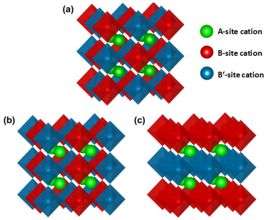 If the different B cations are randomly distributed in the crystal, the DP material is considered to be disordered and the notation AB0.5B’0.5O3 is used, while for alternatively occupied B-sites, DP is viewed to be ordered and the notation is A2BB’O6. The B-site arrangements of the ordered A2BB’O6 DP (visualized by the “Vesta” program [18]), can be set in three ways [7,8], as shown in Figure 1a the NaCl type of ordering with B and B’ occupations alternating in all three spatial directions; Figure 1b the columnar order with alternating B/B’ occupations in two spatial directions; and Figure 1c the B/B’ layered type of ordering, with alternating planes occupied by B and B’ cations. Since in most cases the B and B’ cations possess different valences or oxidation states in the ordered case, the NaCl type of ordering is energetically favorable from the electrostatic point of view, as B and B’ cations are spatially separated from each other [7,8]. This is the reason why the NaCl type of ordering is the most observed type of B-site ordering.