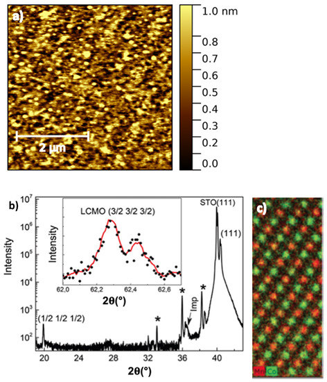 The LCMO films with a high degree of short-range Co/Mn ordering were grown by metalorganic aerosol deposition technique on sapphire [5] and STO(111) [6] substrates (see Figure 3). An atomic force microscopy (AFM) image demonstrates flat surface morphology with the estimated mean-square-roughness, RMS = 0.25 nm. The long-range ordering, quantified by a macroscopic XRD degree of ordering, s = I(½ ½ ½)/I(111) = 1.1 × 10−3, was, however, much smaller than the theoretical value, s = 10−2, calculated for a fully ordered LCMO, possibly indicating the presence of antiphase boundaries [6]. The local Co/Mn ordering, obtained by atomically resolved chemical mapping with EELS and shown in Figure 3, shows the neighboring (111) atomic planes occupied predominantly with Co and Mn ions; however, the full ordering cannot be detected. The valence states of the transition metal cations of Mn4+ and Co2+, experimentally determined by TEM and EELS measurements, point to a globally ferromagnetic ground state due to a Co2+-O-Mn4+ ferromagnetic super-exchange interaction. High Curie temperatures, TC = 226 and 228 K, and high saturation magnetization, MS(4.2 K) = 5.8 and 5.9 µB/f.u., were measured for LMCO(111)/STO(111) and LMCO(111)/Al2O3(0001) films [5,6]. They both indicate a high degree of short-range Co/Mn ordering, s = 0.97, 0.98, estimated as a ratio between the measured saturation magnetization and the maximal theoretical magnetization for the ordered LCMO MS(theo.) = 6 µB/f.c., assuming the ferromagnetically coupled spins of Co2+ and Mn4+ ions. Worthy of note is the fact that the disordered LCMO films possess much smaller values of MS(4.2 K) = 3.5–4.5 µB/f.u., as was shown for PLD-grown films earlier [24,30].