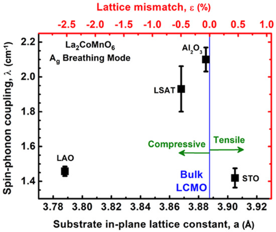 Thus, a spin–phonon interaction can be quantified by the spin–phonon coupling constant, λ, which describes the strength of the magneto-elastic coupling in a DP material and is important for magneto-dielectric applications. In Figure 4, we present the experimentally measured λ values in LCMO films grown on (111)-oriented substrates, actuating different signs and values of epitaxy stress [5]. One can see that the strongest spin-phonon coupling constant, λ = 2.1 cm−1, was obtained for the highly ordered LCMO film (s = 0.98) grown on sapphire, which actuated a very small in-plane compressive stress. Moreover, a large lattice mismatch significantly reduced spin–phonon coupling down to λ∼1.5 cm−1 for LaAlO3(111) with compressive stress, and to λ∼1.4 cm−1 for STO(111) with tensile stress. It is worth noting that PLD-grown LCMO films on STO(100) substrates show a value of λ≈1 cm−1 [24].