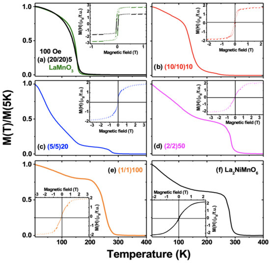 Temperature, M(T), and magnetic field, M(H), (inset at H = 100 Oe) dependences of magnetization (a) of the LaMnO3 film (green) with thickness at dLMO = 16 nm, and of the nLMO/nLNO (n/n) SLs (20/20, black); (b) (10/10, red); (c) (5/5, blue); (d) (2/2, magenta); (e) (1/1, orange); and (f) (SoA, black) grown by MAD technique. Adopted with permission from American Physical Society (Copyright 2021) ref. [9].