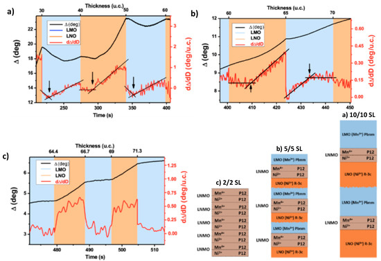 The formation of emergent the LNMO DP phase detected by magnetic and Raman measurements in LMO/LNO SLs means that Ni2+ and Mn4+ oxidation states are realized at the interfaces, yielding a ferromagnetic superexchange interaction and structural transformation into a monoclinic phase. In other words, a charge transfer (CT) reaction such as Mn3+ + Ni3+ → Mn4+ + Ni2+ should occur at the interface, with one eg electron from Mn being transferred to Ni. As we showed recently [35], the CT at SrMnO3(top)/LaMnO3(bottom) interfaces can be effectively detected by the in situ optical ellipsometry within MAD. Using the same approach, the growth and CT at the interfaces in 10/10, 5/5, and 2/2 LNO/LMO SLs was monitored in situ by measurements of the ellipsometric phase shift angle, Δ(t), as shown in Figure 7. One can see that within the first 2–3 u.c. from the interface, both LNO and LMO layers in 10/10 and 5/5 SLs display modified electronic properties. This indicates a CT from the LMO into the LNO layer underneath, governed by a larger electronegativity of Mn compared to Ni [46], as well as a chemical/structural roughening at the LNO(top)/LMO(bottom) interfaces, as reported previously [46,47]. In contrast, in the 2/2 SL with a layer thickness very close to the CT length of ~ 2–3 u.c., the LMO layers, which have already given the electrons to the LNO underneath, show almost constant electronic properties. Moreover, the growth of the LNO layer onto the electronically exhausted LMO without JT distortions also seems to be problem-free. Thus, considering magnetic, Raman, and ellipsometry measurements, we can conclude that charge transfer at the LNO/LMO interfaces, accompanied by their structural transformations, indeed drives the formation of emergent DP LNMO phase. For the short-period 2/2 and 1/1 SLs, the properties are very similar to those of SoA LNMO films [9].