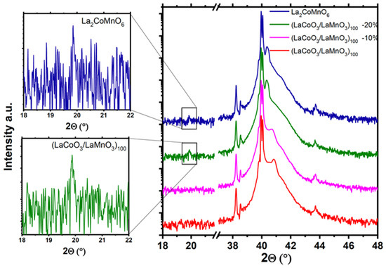 To grow the initial LL-grown LCO/LMO SL the La(acac)3Co(acac)2- and La(acac)3Mn(acac)2 precursor solutions were sprayed alternately (with pauses ~2 s between them and a precursor feeding rate ~1 µL/s) onto the heated substrate Tsub~950 °C. The solution volume necessary for the growth of 1 u.c. of the corresponding perovskite was determined separately in the previously grown single LCO and LMO films, VLCO = 3.82 µL/u.c. and VLMO = 3.8 µL/u.c., respectively. For the growth of the SoA LCMO film, the three precursors (La(acac)3, Co(acac)2, and Mn(acac)2) were dissolved in one solution. Figure 8 shows the XRD results of the produced samples. The SoA film (blue) is considered a reference sample as it shows the expected c-lattice parameter cSoA = 0.387 nm and the superstructure peak at 2θ = 19.9° as an indication of a long-range B-site ordering. The evaluated ~88% degree of B-site ordering from the saturation magnetization MS(5K) = 5.3 µB/f.u. was lower than already reported [5,6] possibly since the growth parameters for this sample were not optimized.