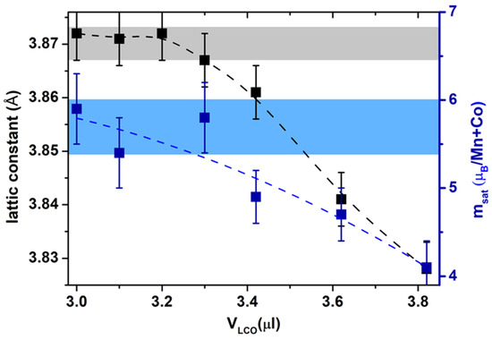 These results are further confirmed by the presence of the (½ ½ ½) peak in the L3 sample (see Figure 8), whose long-range ordering parameter is s = I(½ ½ ½)/I(111)~6 × 10−4, possesses a relative intensity that is much smaller than the theoretical value s = 10−2 for a complete Co/Mn ordering. In order to get a clear impression of the influence of the amount of the deposited VLCO, further samples were produced with VLCO = 3.62 µL/u.c.; 3.30 µL/u.c.; 3.10 µL/u.c., and the results are summarized in Figure 11. One can see a definite correlation between the amount of VLCO and the structural and magnetic properties. In the range of 3.30 µL/u.c. < VLCO < 3.82 µL/u.c. there is an almost linear relationship between the lattice constant and the saturation magnetization. This knowledge allows us to create artificial LCO1/LMO1 heterostructures with structural and magnetic properties very similar to those of SoA LCMO film. However, the relations between the short- and long-range B-site ordering still remain unclear and require further studies.