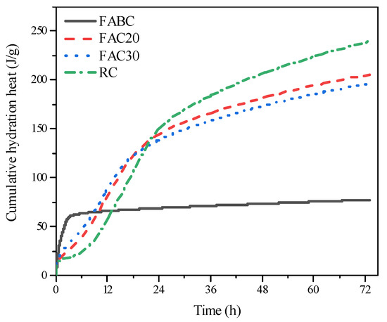 The total hydration heat release of Portland cement across different FABC contents is shown in Figure 2. In summary, an increase in FABC caused a significant increase and decrease in early and total heat release of hydration, respectively. At 3 days, the total hydration heat of Portland cement reached 239 J/g, which was three times higher than that of FABC. FABC’s hydration heat at 12 h was 82.5% that recorded at 3 d, whereas hydration heat of Portland cement at 12 h just reached 26.8% of the total hydration heat of 3 d. This was attributed to the faster hydration rate of C12A7 in FABC compared to that of Portland cement. Moreover, a large amount of hydration heat was released over a short period, the setting time of C3S and C2S was longer in Portland cement, which allowed a large amount of hydration heat to be gradually released after 12 h. The addition of 20 and 30% FABC caused the total heat of hydration of Portland cement to increase to 81 and 88 J/g, respectively, after 12 h, representing a 39.3 and 42.2% increase in the total heat of hydration at 3 d. This was also significantly higher than the total hydration heat of Portland cement at the same time point. These results indicate that FABC has a process of cooperative hydration with Portland cement, and changes the hydration rate of composite cement. This phenomenon may be due to the formation of Ca(OH)2 from the hydration of silicate clinker. Consumption of large amounts during the hydration process of C12A7 breaks the solid–liquid balance of C3S and C2S hydration, thereby improving early hydration of C3S and C2S, and increasing the early hydration exothermic rate of composite cement [19].