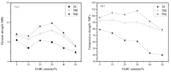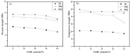 The strength of pastes with different FABC content: (a) Flexural strength; (b) Compressive strength.