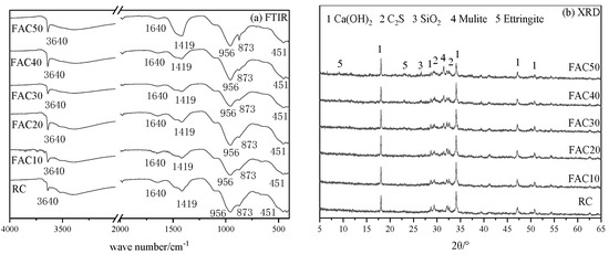 The FTIR spectrum of composite cement hardened paste at 28 d is shown in Figure 5a. From the spectrum, the absorption band at 3430 cm−1 is the asymmetric stretching vibration of OH− (ν3), which indicates the presence of Ca (OH)2 in the hardened paste. Increasing FABC content increased the asymmetric stretching vibration of CO32−, to 1419 cm−1 (ν3), indicating marked carbonization in the pastes. Asymmetric stretching vibrations of Si-O-Si (ν3), at 956 and 873 cm−1, indicated the presence of more C-S-H gels with disordered structure and multiple polymerization states [21]. Notably, increasing FABC content caused a marked absorption band of Si-O-Si, indicating a gradual increase in the polymerization degree of Si-O bonds as well as hydration products. This phenomenon may be attributed to because a direct release of Ca (OH)2 from C12A7, which rapidly reacted with C12A7 to form Ettringite at low calcium content in pastes. In order to maintain the solid-liquid equilibrium, there is a need to ensure that hydration of Portland cement is in the affirmative direction, and C-S-H hydration products are gradually increased. The reaction equation is shown in Formulas (1) and (2). Figure 5b shows the XRD spectrum of composite cement hardened paste at 28 d. Although C-S-H gel and Ettringite (Ca6Al2(OH)12(SO4)3•26H2O, AFt, 2θ = 9.2°) are generated in large quantities, there are still un-hydrated silicate clinker minerals in the hardened paste, while mullite and quartz particles from fly ash (2θ = 25~28°) are abundant [22]. Based on this, it is evident that the characteristic peak of Ca (OH)2 in the XRD spectrum first increases, then decreases with an increase in FABC content. This result further corroborates the findings on the strength of the pastes. The reaction of Ca2+, SO42−, Al (OH)4− generating to AFt would consume a lot of Ca (OH)2, which would destroy the solid–liquid equilibrium of C3S and C2S. It promotes the hydration of pastes, releases more Ca2+, and finally improves the content of hydration products. Hence, the forming of Ettringite is beneficial to the hydration of composite cement.