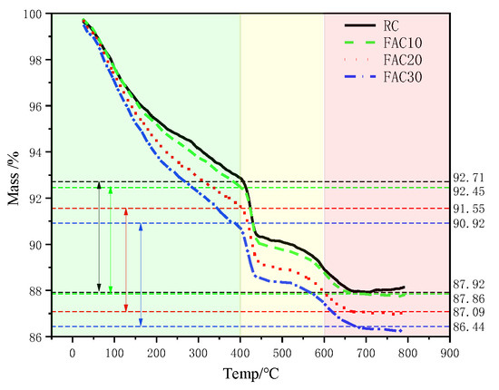 Results from thermal analysis of composite cement hardened pastes at 3 d are shown in Figure 6. In summary, the first weight loss occurs at 80~200 °C, and this is mainly caused by the decomposition of C-S-H gel, Ettringite and other hydration products. Mass losses of RC, FAC10, FAC20 and FAC30 hardened pastes are found to be 6.61, 6.76, 7.59 and 8.51%, respectively, indicating that hydration of products increases with an increase in FABC content. The second weight-loss stage occurs at 400–500 °C, and mainly comprises the decomposition of Ca (OH)2. Notably, water loss ratios for Ca (OH)2 in RC, FAC10, FAC20 and FAC30 hardened pastes were found to be 2.88, 3.07, 3.19 and 2.55%, respectively. Although an increase in FABC content enhanced the formation of Ca (OH)2, content above 30% caused a marked decrease in total Ca (OH)2. This is attributed to the fact that hydrated products of C12A7 react with gypsum and calcium hydroxide to form Ettringite. The third weight-loss stage occurs at 600–800 °C, and mainly involves the decomposition of CaCO3 due to carbonization. The mass-loss rate of CaCO3, after decomposition, is FAC30 > FAC10 > RC > FAC20. In summary, FABC increased the total amount of hydration products, such as C-S-H gels, Ettringite and calcium hydroxide, and accelerated the early hydration rate of Portland cement.