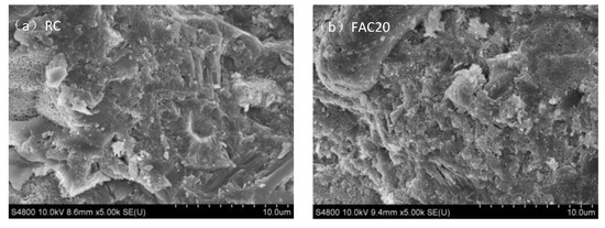 Flexural and compressive strengths of Portland cement mortars with different contents of FABC are illustrated in Figure 4. From the results, it is evident that increasing FABC contents to 40% generated a slight decrease in both flexural and compressive strengths of mortars at 3, 28 and 90 d. When the FABC content was less than 20%, the guarantee rates of both flexural and compressive strengths of mortars could reach more than 90% at 3 d. However, an FABC content of more than 20% resulted in a marked decrease in early flexural and compressive strengths of mortars, as well as the rapid development of later strength. Moreover, compressive strengths for FAC30 and FAC40 reached 46.2 and 44.6 MPa respectively, at 90 d, these were represented 93.3 and 90.1% of RC at the same period, respectively. This was mainly attributed to the occurrence of more pores on the surface of clinker minerals, as well as a 20% increase in the volume porosity of early hydration hardening paste [20]. Moreover, a decrease in internal pores of the specimen, coupled with no dense formation of the structure, caused a reduction in the early strength. However, at 90 d, the specimen’s internal pores decreased, causing a gradual improvement in the strength of mortar specimens during late hydration. It was indicated that [17] the high porosity was the main cause of the low early strength of FABC pastes, and it was also not conducive to the development of the early strength of composite cement. However, with the increase of FABC contents, the long-term strength would be improved with the densification of hydration products. In conclusion, the long-term strength of motars will obviouly increase when the proportion of FABC is less than 30%.