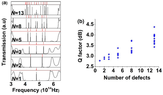It can be observed from Figure 2a that every mode of any hierarchy will split into submodes to form the Cantor spectrum. In the third hierarchy there are three modes: the mode on the both sides will further split into submode for the global structure, and the middle mode will also split in the same manner for next stage. Thus, it turns out that the Fibonacci-spaced defect resonators have a perfect self-similar spectrum. The Q factor of the resonant modes would increase exponentially with the appearance of narrower optical modes, as shown in Figure 2b. Considering only the resonant modes in the center of the band, the Q value increases from 480 for to 23,960 for , where the size of the device increases from 1.694 to 5.862 μm.