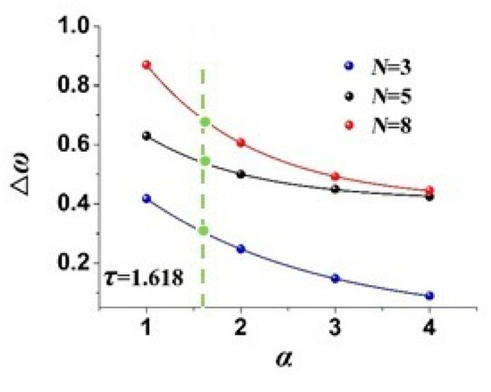 Some features of the regular quasicrystals are not required for the operation of microcavity lasers. According to the analytical model, the regular quasicrystals can be modified to be an ideal resonator for microcavity lasers. For example, the mode splitting provides a simple, flexible and versatile approach for the design of high performance resonators [36,37,38,39,40]. It would allow us to engineer the behavior of the cavity mode simply by tailoring the separation and size of the defects. Here, the ratio is arbitrary. For the structure becomes periodic and for equal to the golden mean 1.618, it becomes the canonical Fibonacci chain [41]. The simulation results show that , which refers to frequency detuning from due to coupling, decreases exponentially with increasing the ratio , as shown in Figure 3.