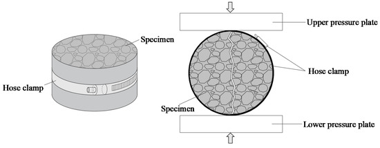 Before evaluating the autogenous crack self-healing efficiency of the mortar specimen, it was necessary to make cracks that met the test requirements. In this study, a new crack production method was developed; with this method, it is easy to control crack width and shape (Figure 1). At 3 days of age, the cylindrical mortar specimen was taken out from the curing room and tightly wrapped along the side of the specimen by the steel hose clamp. Then, the splitting tensile strength test (Figure 1) was used to generated cracks in the specimens. Crack width was controlled at 200~300 μm by adjusting the tightness of the hose clamp.