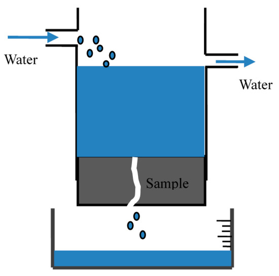 A constant water head permeability test (Figure 2) was carried out to obtain the initial water permeability coefficient of the specimens k0 (cm/s), as well as the water permeability coefficient of the specimens after healing for a certain time kt (cm/s). For the detailed calculation of the water permeability coefficient, please refer to our previous research [34]. In addition, the relative permeability coefficient was calculated to evaluate the self-healing efficiency of mortar specimens according to Equation (2).