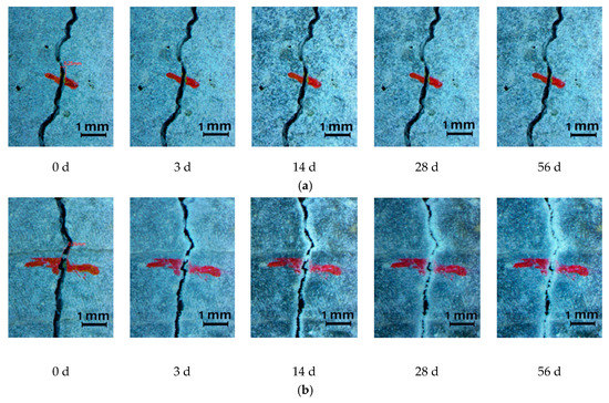 Figure 3 shows that the closure of surface cracks in mortar specimens under different curing conditions and after different healing times. It can be seen that no visual healing was observed in specimens exposed to standard curing, even after a healing period of 56 days. However, complete crack sealing was found in specimens incubated in water for 14 days. For specimens under wet–dry cycles, only partial crack filling was showed.
