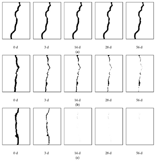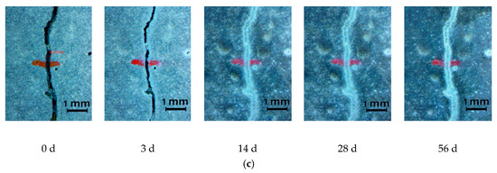 The closure of surface cracks in specimens under different curing conditions after different healing times: (a) standard curing (>95% RH); (b) wet–dry cycles; (c) submerged in water (d denotes days).