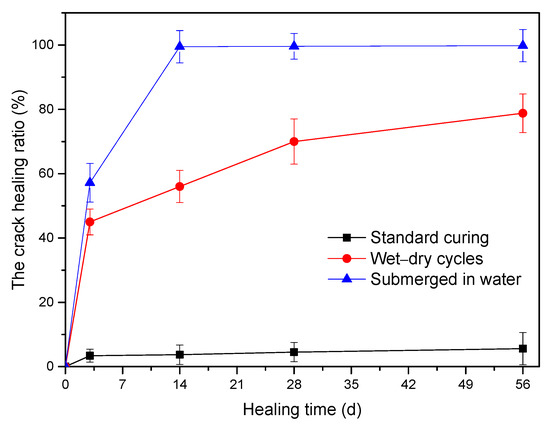 Crack-healing ratio of specimens under different curing conditions after different healing times (d denotes days).