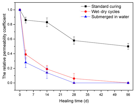 The measurements of crack width, crack area and water permeability were widely used to characterize the healing effect [9,14,31,32]. In Section 3.1.1, the crack-healing ratio based on a reduction in crack area was used to visualize the self-healing of surface cracks, but it could not reflect the internal healing effect. Therefore, the water permeability test, which is not only related to the sealing of surface cracks but also to the healing of internal cracks, was conducted to further evaluate the self-healing efficiency of the cracks. Figure 6 shows the change in relative permeability of specimens under different curing conditions and healing times. The result is consistent with that of the crack-healing ratio. The specimens incubated in water and under wet–dry cycles exhibited a better recovery in water penetration resistance compared to specimens exposed to standard curing. An obvious decline in relative permeability was observed in specimens incubated in water and under wet–dry cycles, which indicated that the presence of water is essential for the autogenous self-healing of early age cracks in cement mortar. In addition, it is worth noting that, although the crack-healing ratio for wet–dry cycles specimens was obviously inferior to that of specimens incubated in water, the change in relative permeability coefficient for wet–dry cycle specimens was similar to that of specimens incubated in water. This may be attributed to more healing products being formed in internal cracks for specimens under wet–dry cycles.