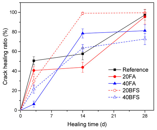 The crack-healing ratios of mortar specimens containing different SCMs with various content are shown in Figure 7. As can be seen, the addition of SCMs changed the autogenous self-healing behavior of surface cracks in mortar specimens. The influence of SCMs on the crack-healing ratio is related to their type and content. For BFS specimens, the crack-healing ratio decreased with the increase in BFS content. Moreover, 20BFS exhibited a higher crack-healing ratio compared to the reference; however, 40BFS showed a lower crack-healing ratio compared to the reference. For FA specimens, the crack-healing ratio also decreased with the increase in FA content. However, both 20FA and 40FA showed a lower crack-healing ratio compared to the reference after a healing period of 28 days. In general, it is not beneficial to replace cement with FA or BFS for the self-healing of early age surface cracks (pre-cracking age of 3 days) in mortar specimens (except 20BFS specimen). Comparing FA with BFS, at a given content of 20%, BFS specimens exhibited a higher crack-healing ratio compared to FA specimens. However, FA specimens showed a higher crack-healing ratio compared to BFS specimens when the content was increased to 40%.