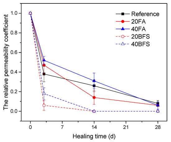 Figure 8 shows the change in relative permeability of specimens containing different SCMs with various content over different healing times. The changing trend of regaining water tightness is different from that of the crack-healing ratio. This is because regaining the water tightness of the pre-cracked mortar specimens is not only related to the sealing of surface crack but also to the healing of internal cracks. For BFS mortars, both 20BFS and 40BFS showed better regaining abilities of water tightness compared to the reference specimens. Although a lower crack-healing ratio after healing for 28 days was observed for 40BFS mortar compared to the reference, the higher regaining capacity for water tightness may be attributed to more healing products being formed in internal cracks due to the ongoing hydration of more unreacted BFS particles. As for FA mortars, the regaining of water tightness declined with the increasing FA content. This is because that the hydration activity of FA is low and not enough calcium hydroxide can be utilized to activate the hydration of unreacted FA particles in internal cracks for mortars with a high content of FA. Moreover, it was noted that 20FA and 40FA exhibited a lower decline in the relative permeability coefficient after healing for 3 days compared to the reference, but almost the same decline in the relative permeability coefficient after healing for 28 days was observed compared to the reference. This is because unreacted FA particles in the crack cannot be activated in the early healing process but can be activated as the healing time increases. It also can be found that BFS mortars exhibited a better regaining of water tightness compared to FA mortars; this is due to their higher hydration activity and CaO content for slag.