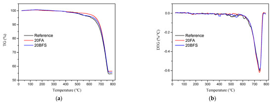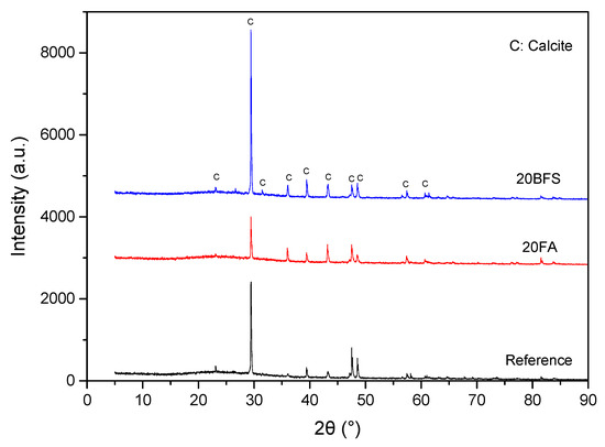 After crack-healing quantification, XRD, SEM and TG/DTG were conducted on the healing products scraped from the healed surface cracks of the referenced specimens, as well as the specimens that contained different supplementary cementitious materials (SCMs). Figure 9 shows the XRD patterns of the healing products formed in mortar specimens containing different supplementary cementitious materials (SCMs) compared to the reference. No significant differences were found for the diffraction peaks of all samples. Calcite was detected as the major crystal healing product for all samples. SEM observations indicated that micron-sized calcite crystals with a typical rhombohedral morphology were closely packed together, as shown in Figure 10. In addition, the TG/DTG curves of the healing products in the crack mouth are shown in Figure 11. An obvious weight loss in the range of 600–800 °C was found, and the corresponding peaks related to the decomposition of calcium carbonate at about 750 °C were observed in all samples. The weight losses between 600 and 800 °C of reference, 20FA and 20BFS were 41.12%, 40.93% and 40.45%, respectively. According to the thermal decomposition equation of calcium carbonate, the percentages of calcium carbonate in the healing products from reference, 20FA and 20BFS were calculated as 93.46%, 93.03%, and 91.94%. The results of TG analysis were consistent with XRD and SEM, indicating that the major healing product from the healed surface cracks of the referenced specimens and the specimens containing different supplementary cementitious materials (SCMs) was calcium carbonate.