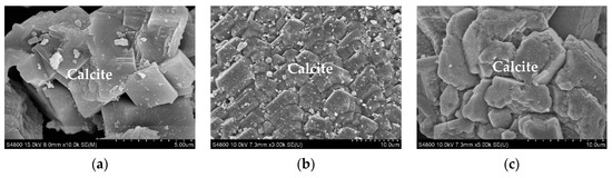 (3) The major healing product in surface cracks of specimens with and without SCMs was micron-sized calcite crystals with a typical rhombohedral morphology.
