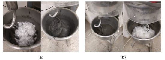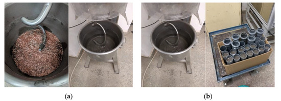 Geopolymer specimens were prepared using sodium promoter, fly ash, and sand (the ratio of sand to fly ash was 1:1). The activation solution was made using a 10-molar (10 M) NaOH solution combined with the sodium silicate R-145 solution (with a molar module of 2.5 and a density of around 1.45 g/cm3, with a ratio of NaOH and Na2O + SiO2 of 1:2.5). The technical NaOH in flake form and tap water was used instead of distilled water to make NaOH solution. The alkaline solution was prepared by pouring sodium silicate and water over solid sodium hydroxide into the aqueous solution of sodium silicate and water. The solution was mixed and left over night until its temperature stabilized and the concentrations were equalized. The fly ash, sand, and alkaline solution were mixed for about 15 min using a low-speed mixing machine in order to create a homogenous paste. A quarter of the specimens were reinforced with 1% (by mass) of short PPFs (approximately 3 mm in length), another quarter of the specimens were reinforced with 5% of the same PPFs, another quarter of the specimens were reinforced with 1% steel fibers (approximately 18 mm in length), and last quarter of the specimens were plain geopolymer. Next, the mixes were poured into the plastic molds, as shown in Figure 1 and Figure 2. The specimens were hand-formed, and then the air bubbles were removed by vibrating. The molds were heated in the laboratory dryer for 24 h at 75 °C. After the geopolymerization process, specimens were unmolded [23,24]. All of the geopolymer specimens were prepared at Cracow University of Technology (CUT).