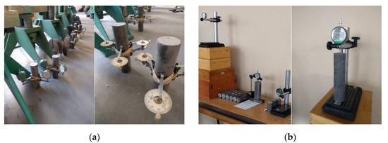 For creep strain tests in compression, specimens were prepared according to RILEM TC 107-CSP recommendations [25]. All specimens were shaped to dimensions of Ø46 × 190 mm or approximately 1:4 diameter to height ratio. For stain gauge attachment, 6 aluminum plates (10 × 15 mm) were glued in pairs to each specimen. Afterwards, strain gauges were attached to those plates, as is shown in Figure 3a. Two aluminum plates were glued to the specimens to determine the shrinkage—one to the top and one to the bottom part of it. Hereupon, shrinkage specimens were placed in the measuring stand to determine the shrinkage strains throughout testing time, as is shown in Figure 3b. All the specimen preparatory work was done at Riga Technical University (RTU). Creep and shrinkage tests were carried out in a room with controlled atmosphere conditions: temperature 24 ± 1 °C and relative humidity 30% ± 3%.