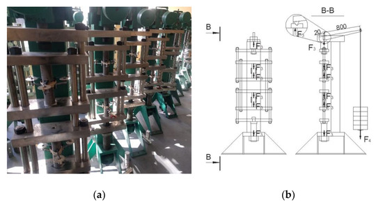 Creep test specimens set up in stands (a) and the test stand scheme (b) [26].