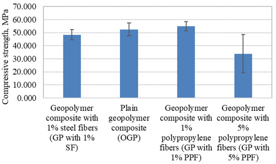 The applied load and counterweight amount necessary for creep test stands were calculated, considering the compressive strength values represented in Table 1. As Moradikhou states [27], the compressive strength improvement due to fiber incorporation is slight. However, with 5% PPF and 1% SF incorporation, the compressive strength is significantly lower. Ravinder et al. claimed that when fiber dosage increased from 0% to 0.3%, the compressive strength increased by 6% [28]. From Figure 5, it is clear that 1% PPF inclusion into the mix has improved the compressive strength of the composite. The compressive strength has increased by 4.9% in contrast to OGP. Other authors have observed that the compressive strength went up with a certain fiber inclusion amount, and when this amount is exceeded, the compressive strength drops significantly [29,30]. The compressive strength increased up until the fiber amount reached 0.60% by volume. Afterwards, the compressive strength of the tested high-strength concrete specimens drops significantly down to the compressive strength level of a plain high-strength concrete specimen (PPF reinforcement 0.9% by volume). Similarly, it is with geopolymer composites where specimens with 5% PPF incorporation show an 18.62 MPa or a 35.5% drop from OGP compressive strength. Furthermore, the error amount in the compressive strength tests for the 5% PPF reinforced composites are twice as big as those for plain geopolymer specimens; therefore, it seems that a higher amount of fiber incorporation into the composite does not only affect the mouldability of it but also an inner structure that significantly affects compressive strength.