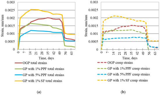 Reinforced and plain geopolymer composite total strains (a) and creep strains (b).